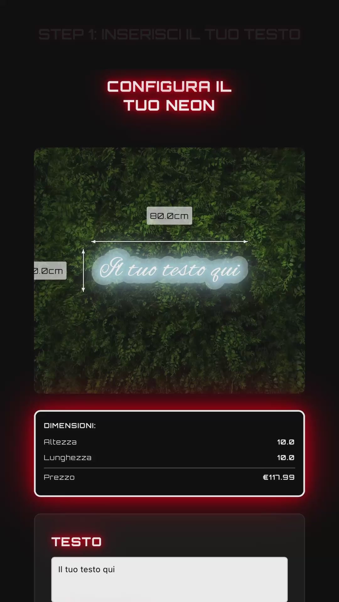 Il tuo design, la tua visione, il tuo preventivo. Usa il nostro software di personalizzazione per creare la tua insegna al neon e vedere l'anteprima in tempo reale. Carica il tuo logo o design e ti invieremo un mock-up 3D dettagliato e un preventivo in sole 24 ore, veloce, gratuito e senza impegno.